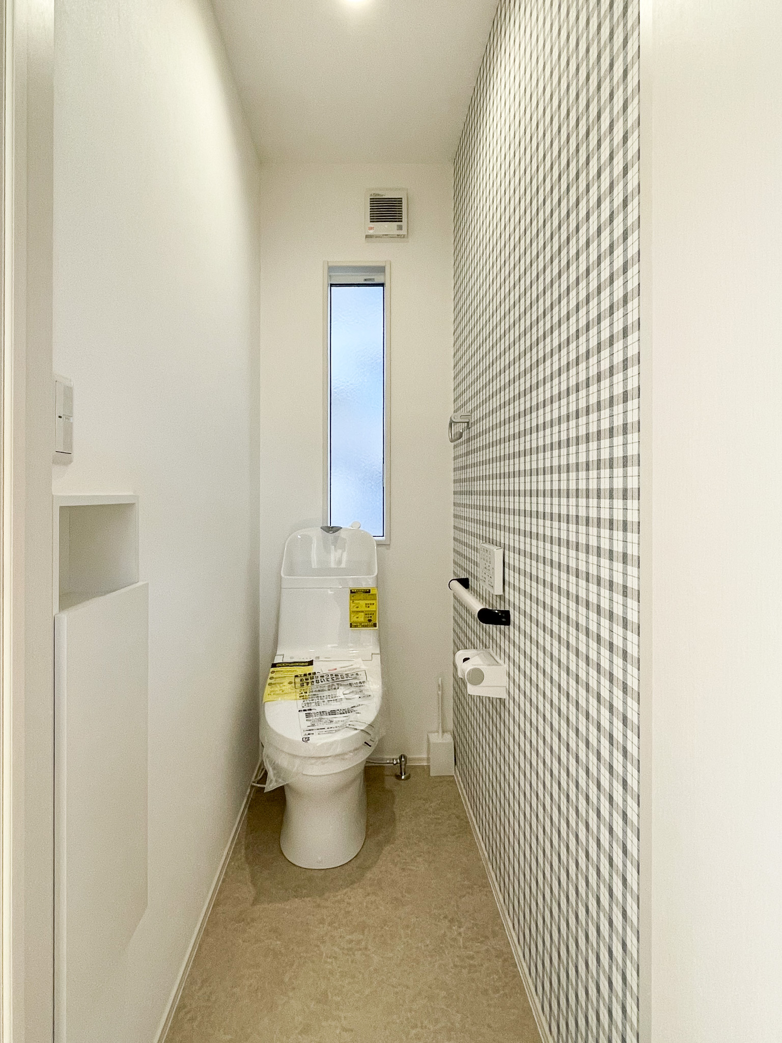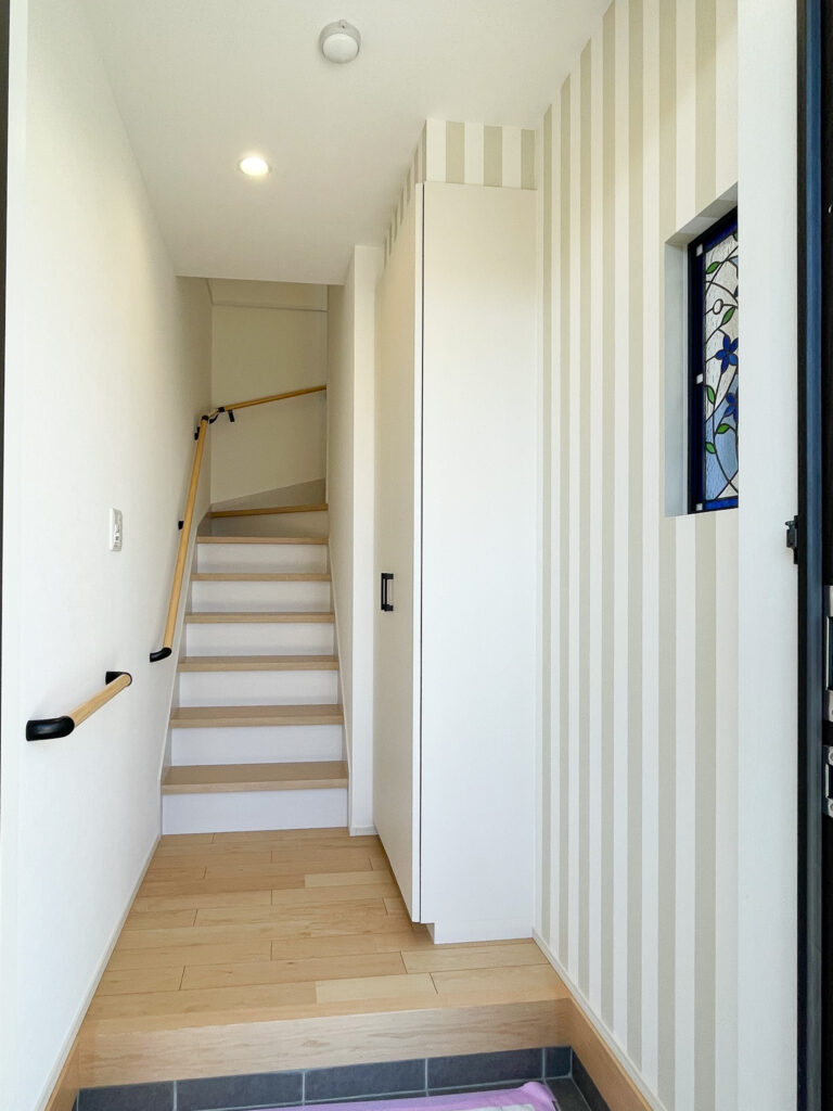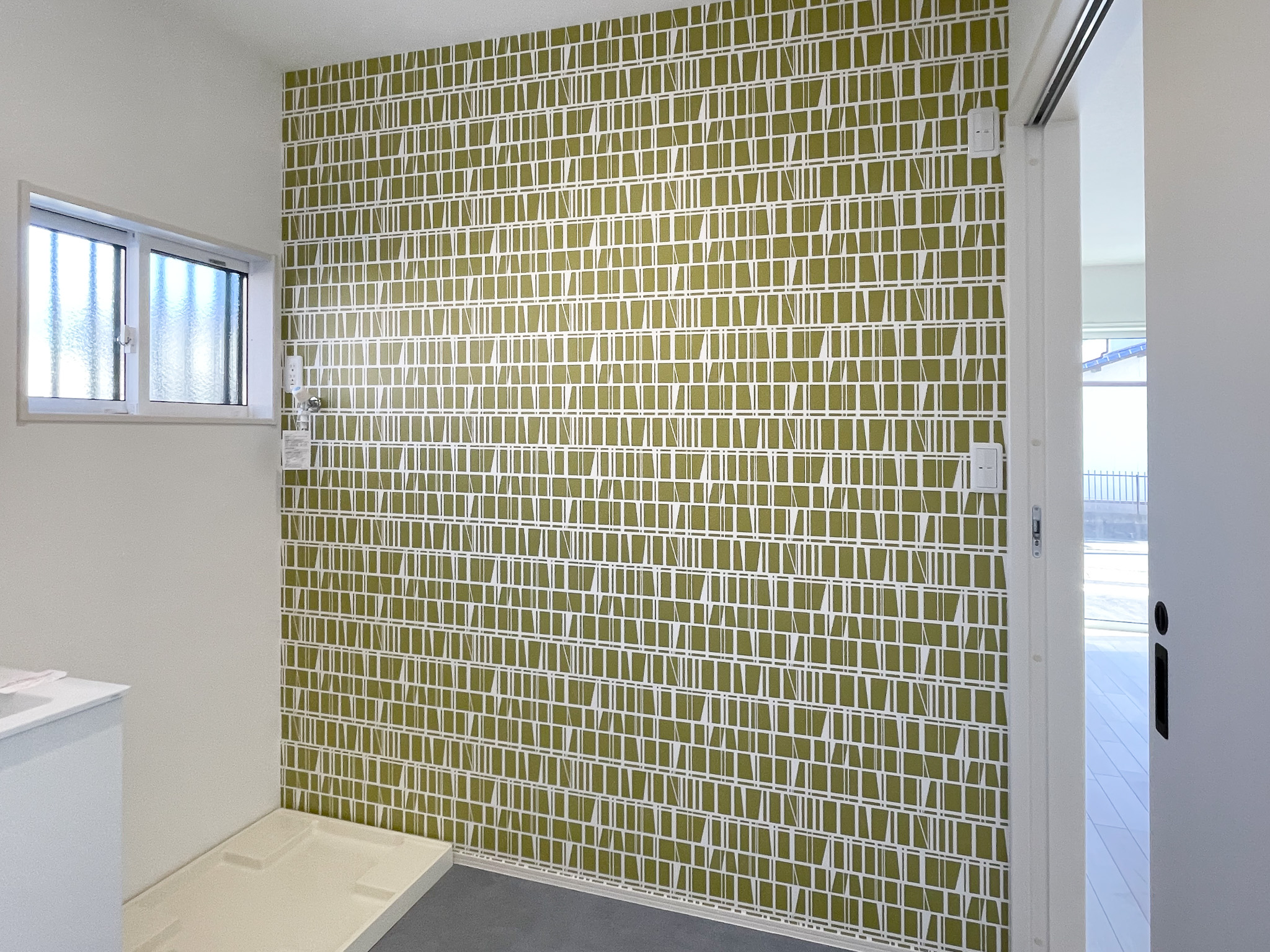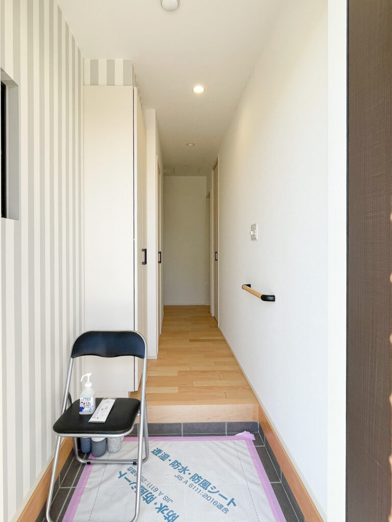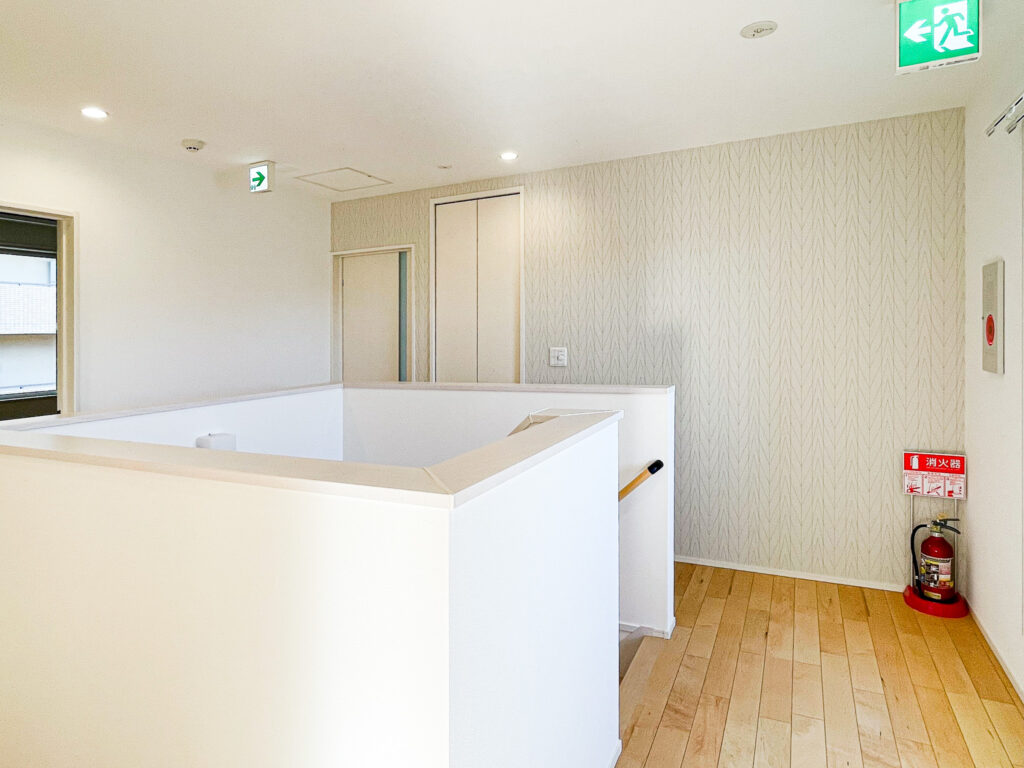 ▲ライトグレーにオレンジのラインが印象的な共有部のアクセントクロス