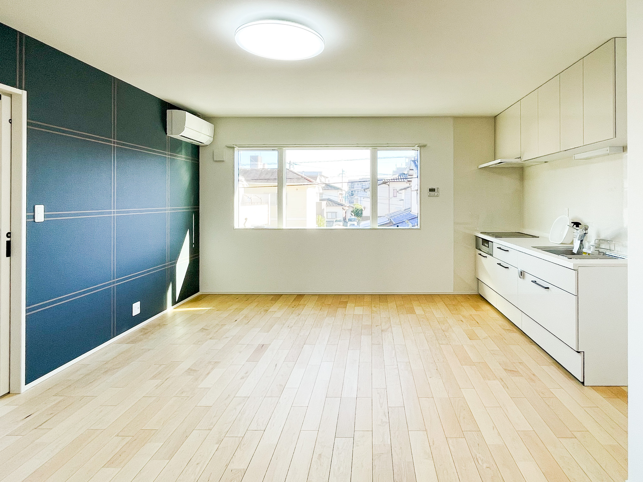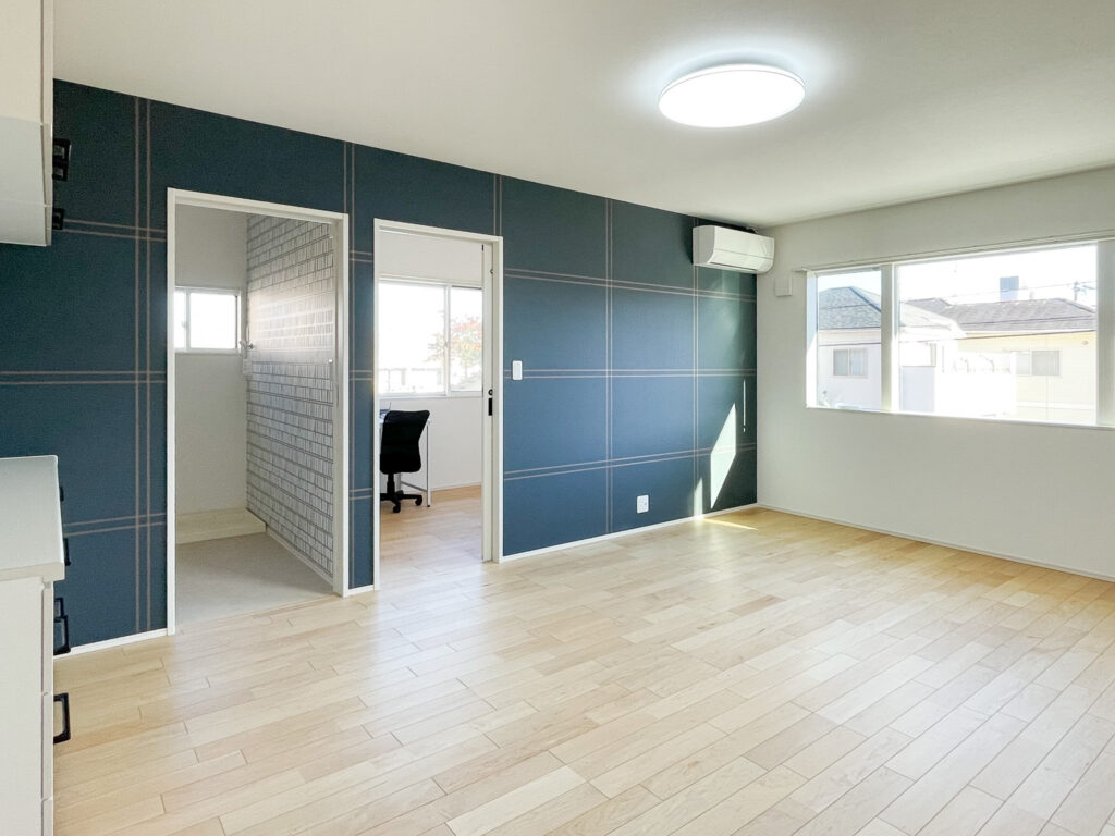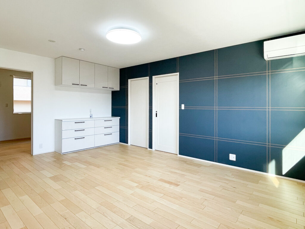 ▲▼2階リビング・ダイニングのアクセントクロスは1階の色違い。紺にオレンジのラインも素敵です。