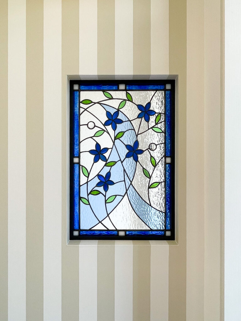 ▲1、2階を隔てる壁にはオリジナルデザインのステンドグラスが施工されています。