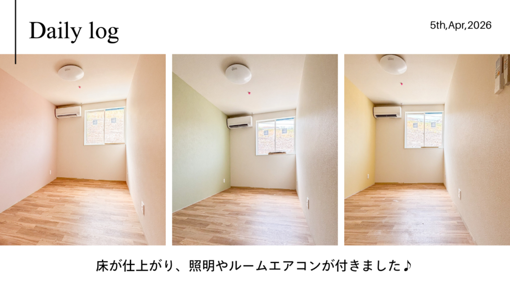 現在、建物内部では壁紙の施工や設備の取り付けなど、仕上げの工程に入っています。前回のご報告時には、壁紙の施工が終わったところでしたが、今度は床がが仕上がり、照明やエアコンが設置されました!前回のお知らせ記事での報告写真と見比べてみてくださいね!