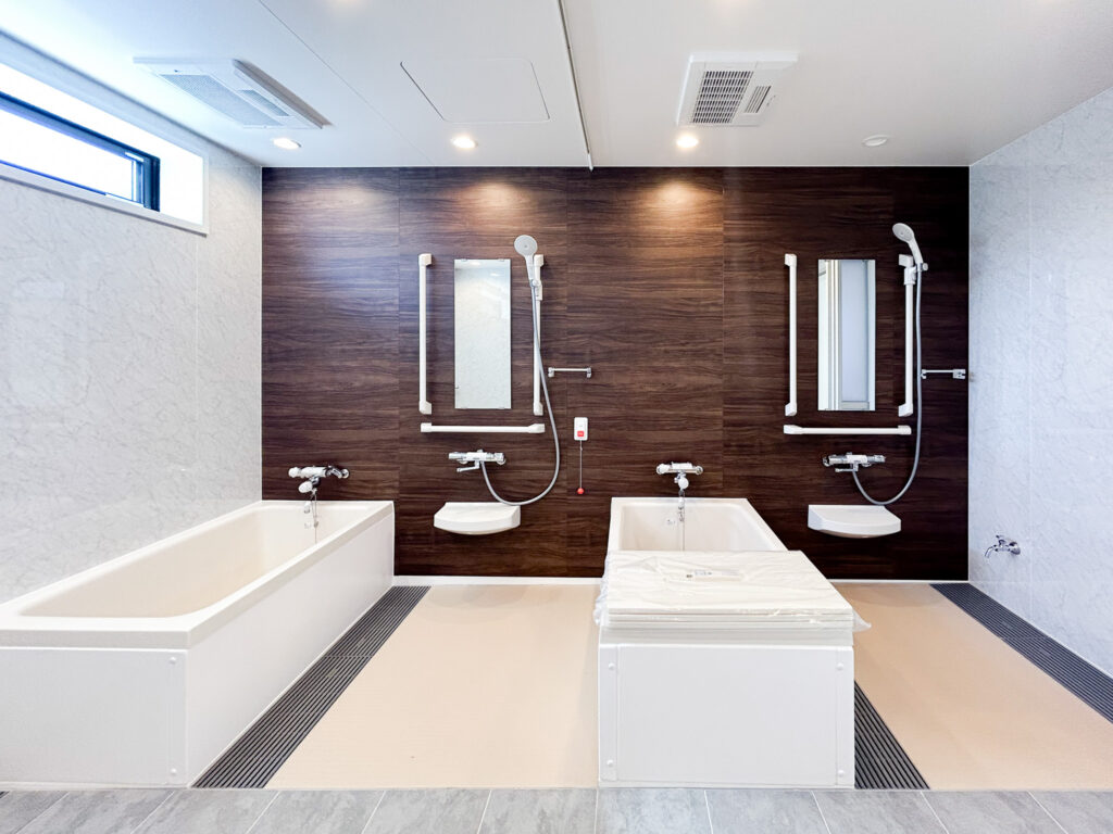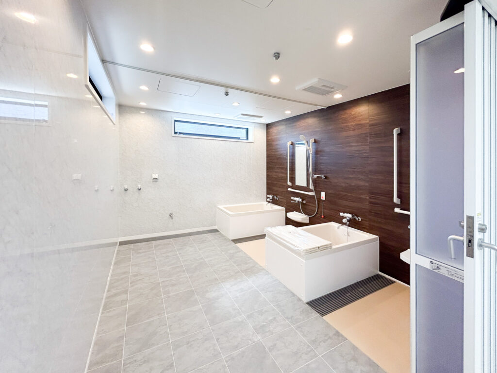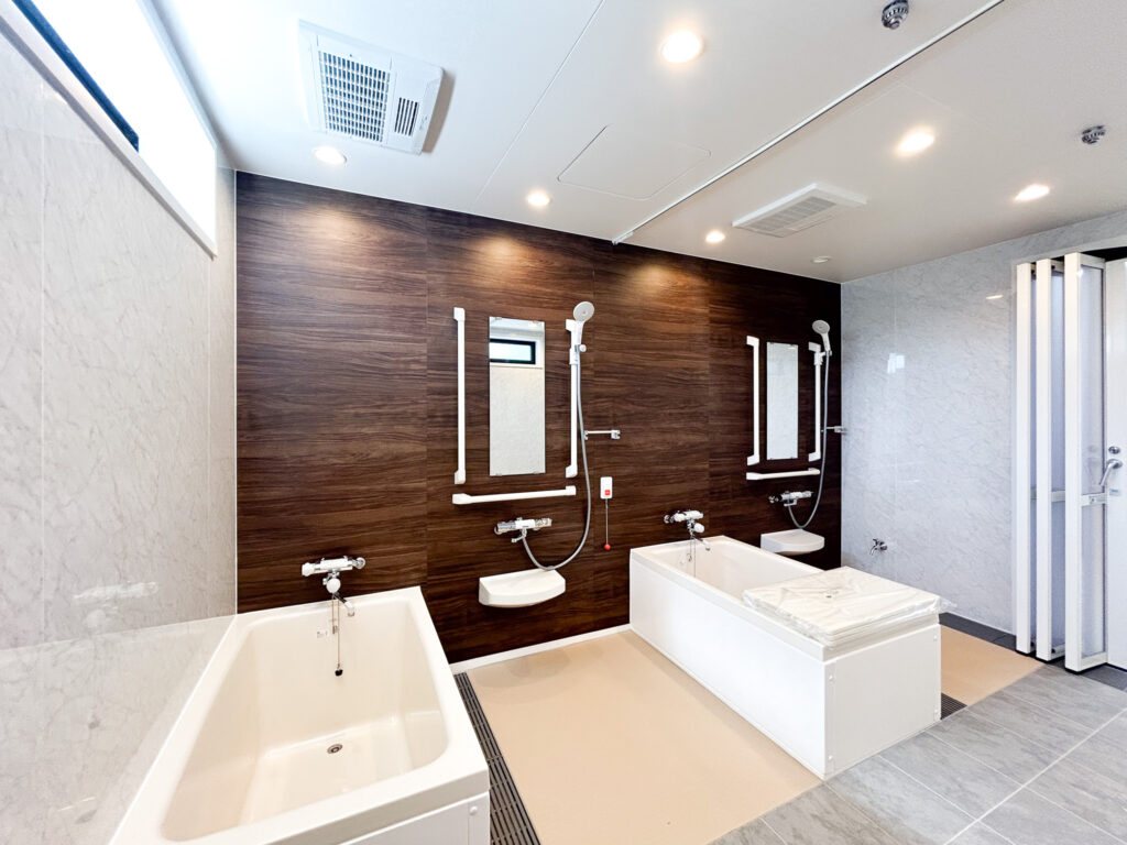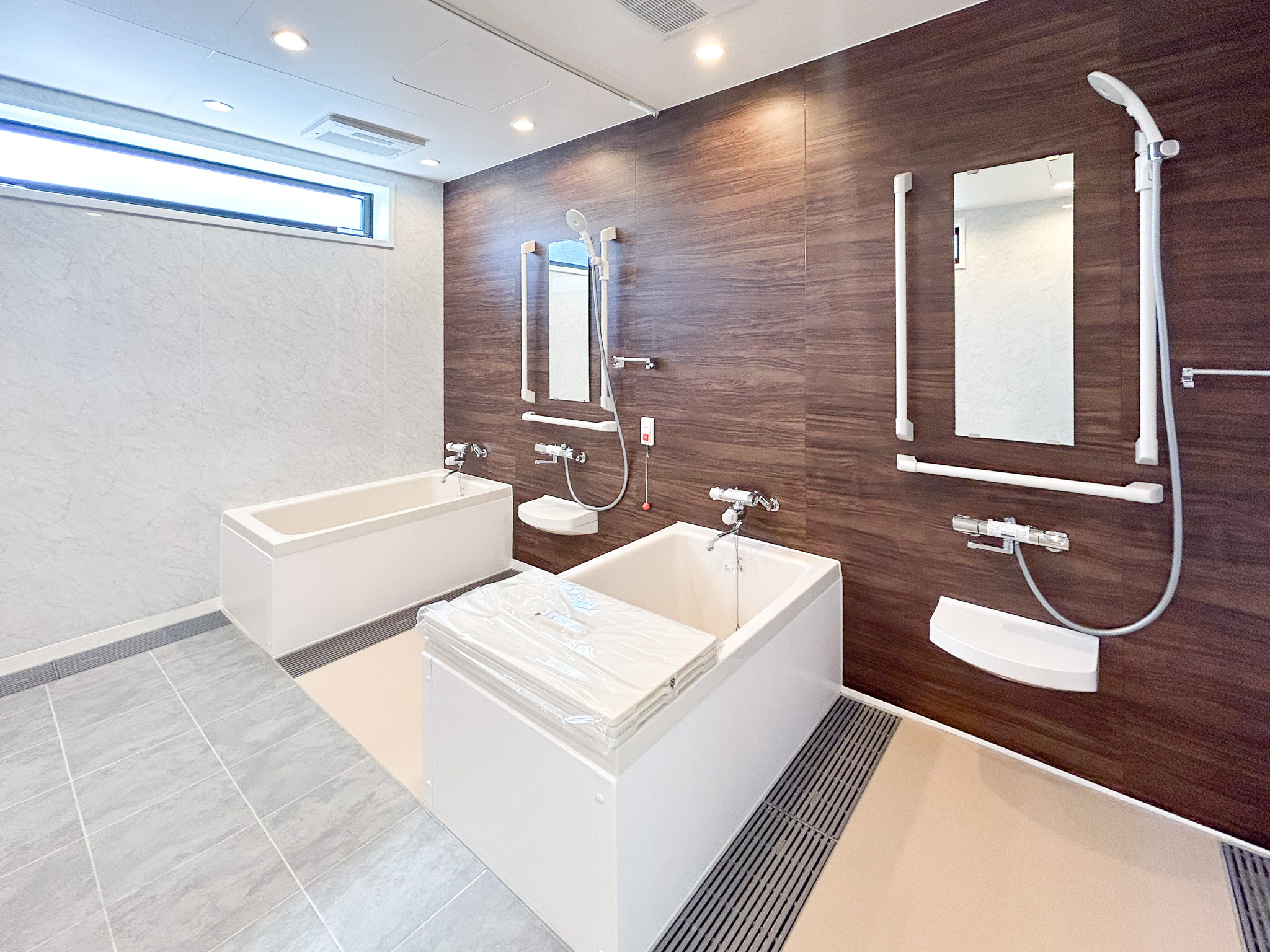 広い空間に浴槽が2つある特殊浴槽介助が必要な方も解除する側にも優しい設計