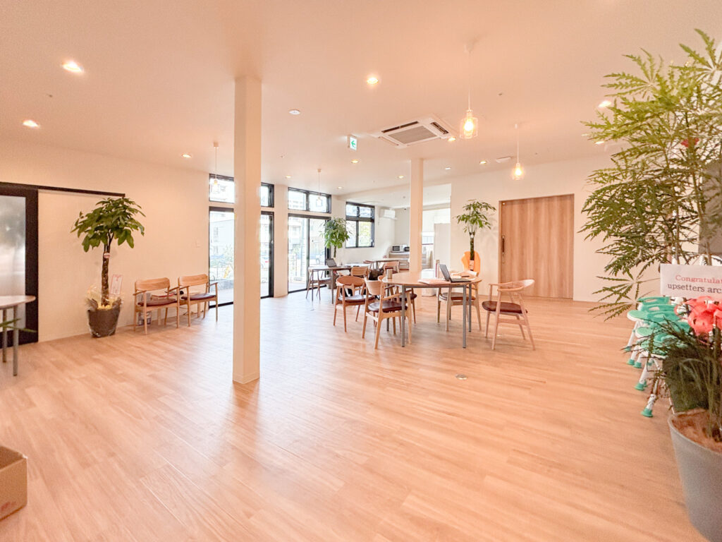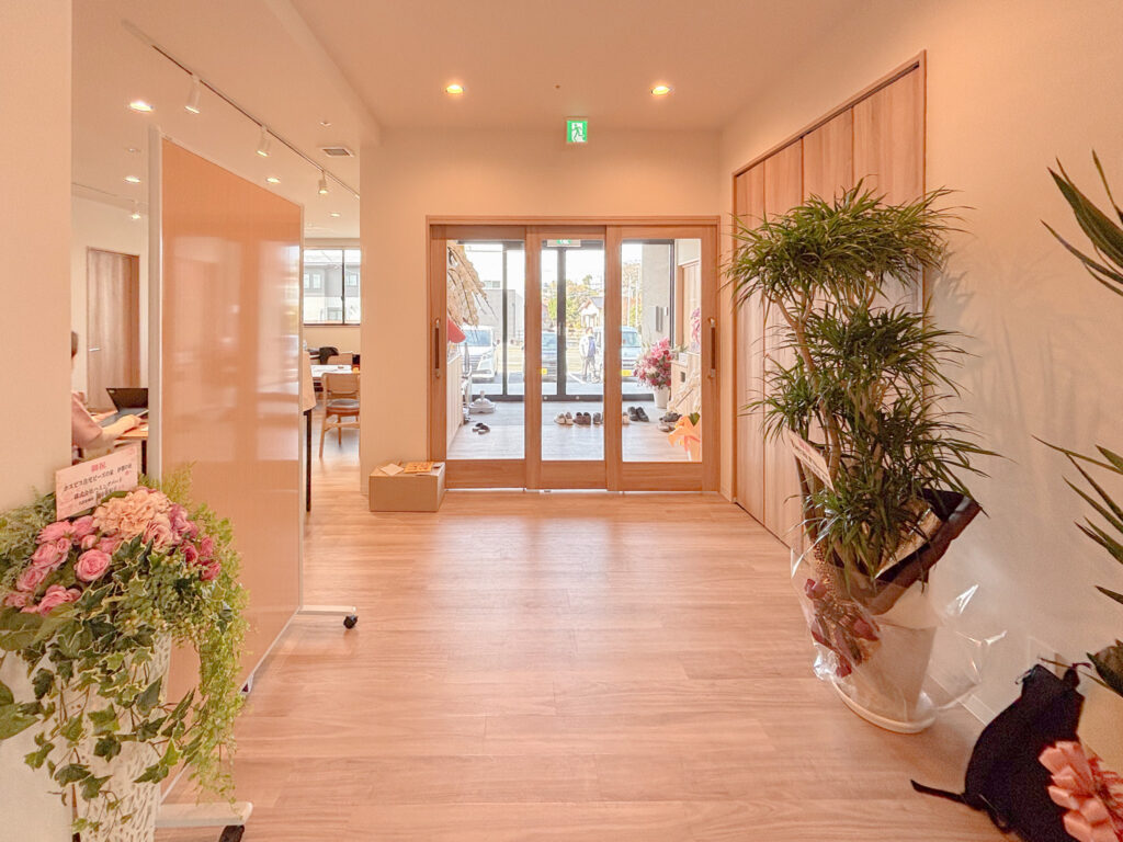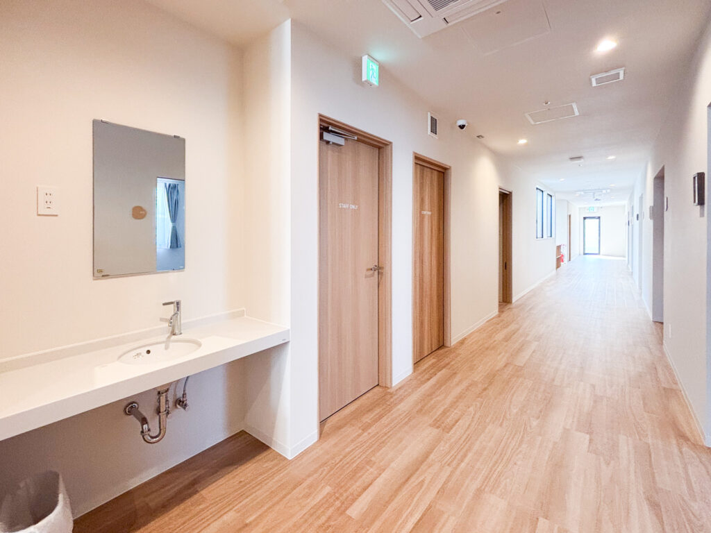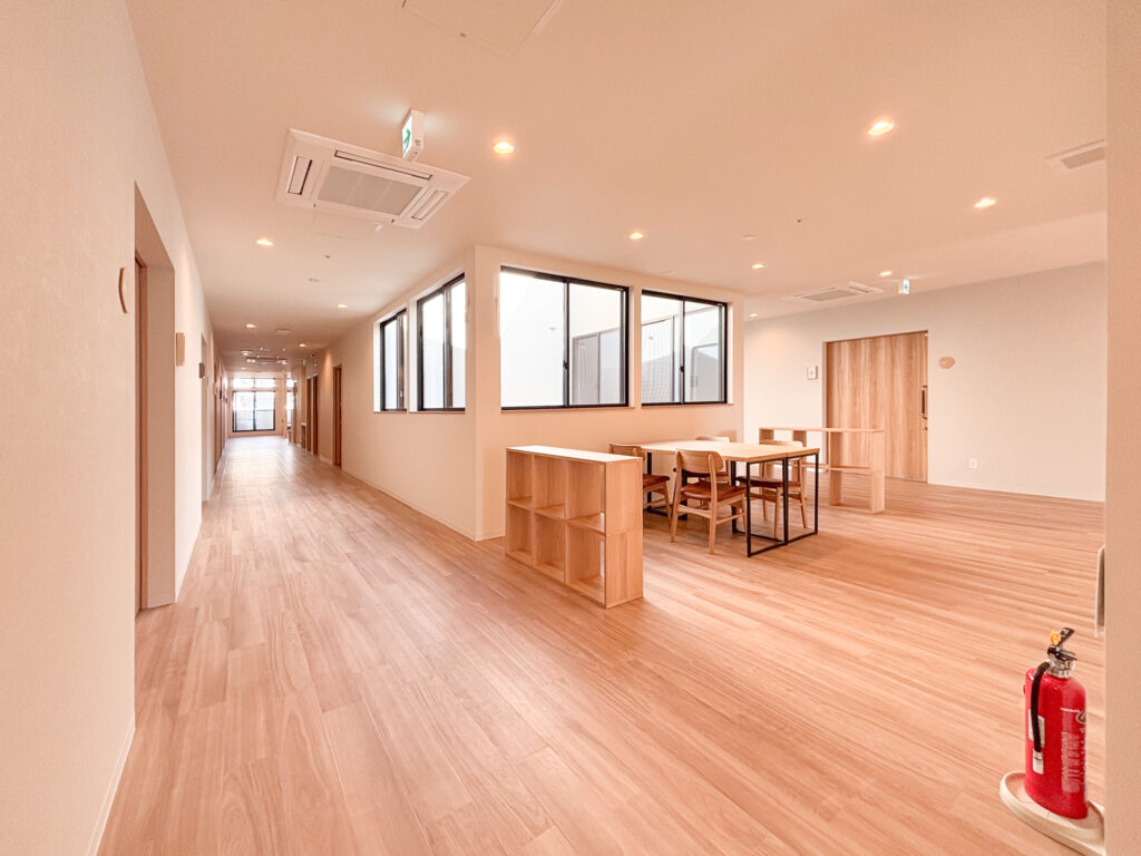▲共有スペース 玄関左側にはスタッフエリアの事務室や更衣室などがあります。