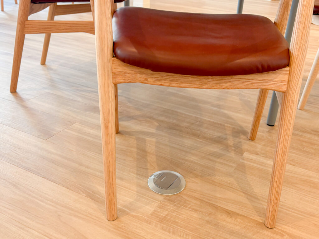 ▲ 食堂内にはm床コンセントを設置し、広い空間でも電源に困らない工夫
