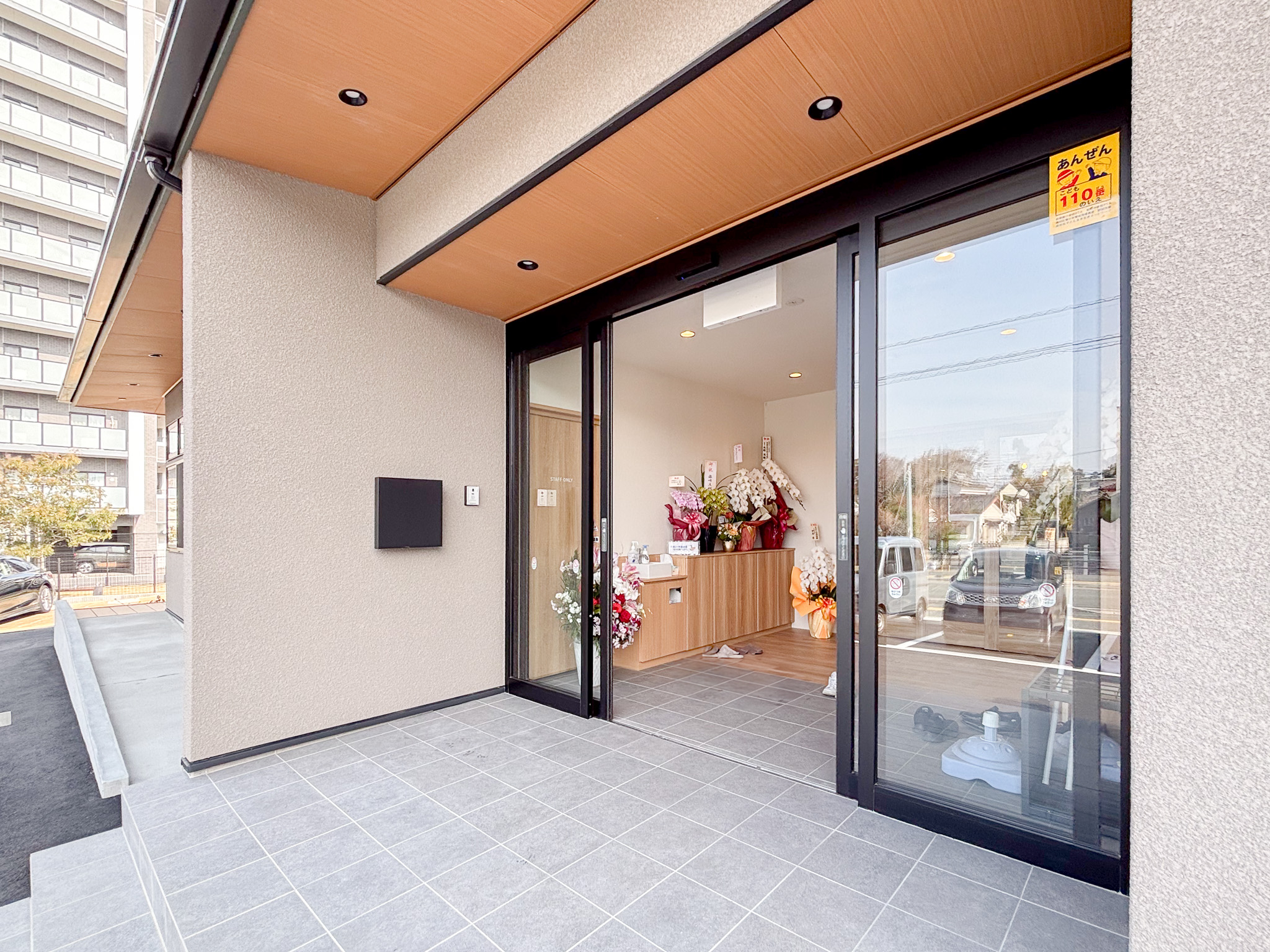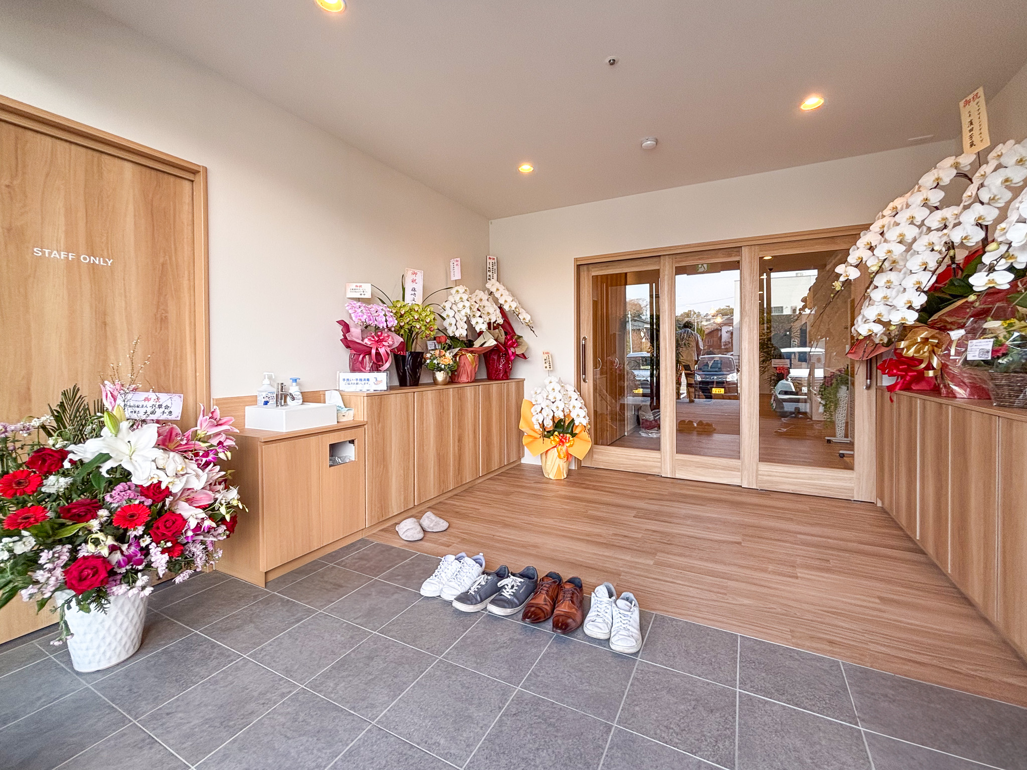 ▲共有スペース 玄関左側にはスタッフエリアの事務室や更衣室などがあります。