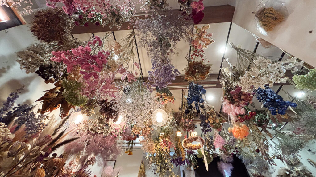 ▼天井にもたくさんのドライフラワーが飾られて、販売されています。