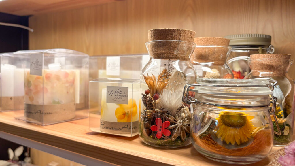 キーホルダーやキャンドルは同じものはなく、カラーリングも様々で見ているだけで楽しくなるものばかりです。
