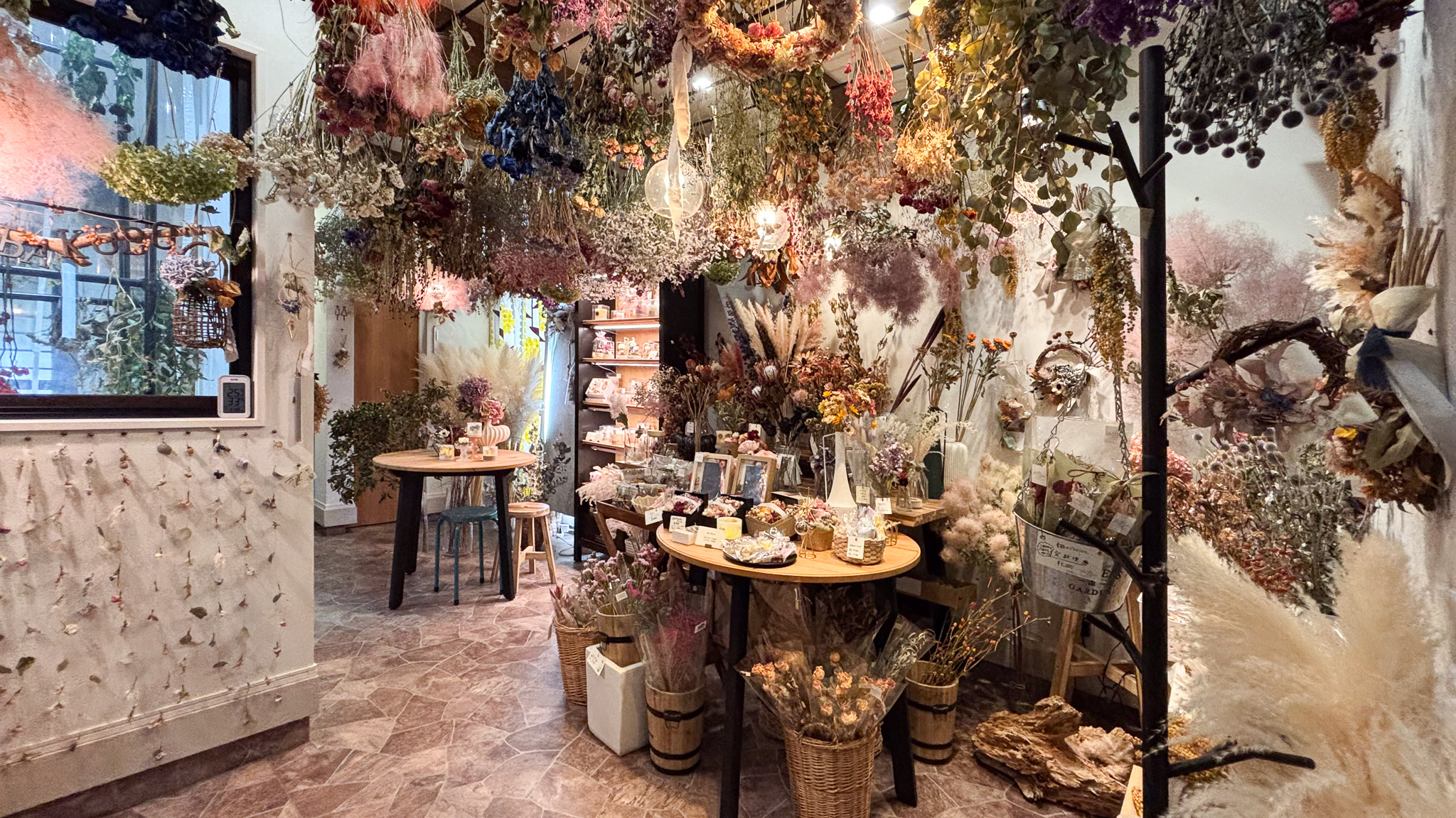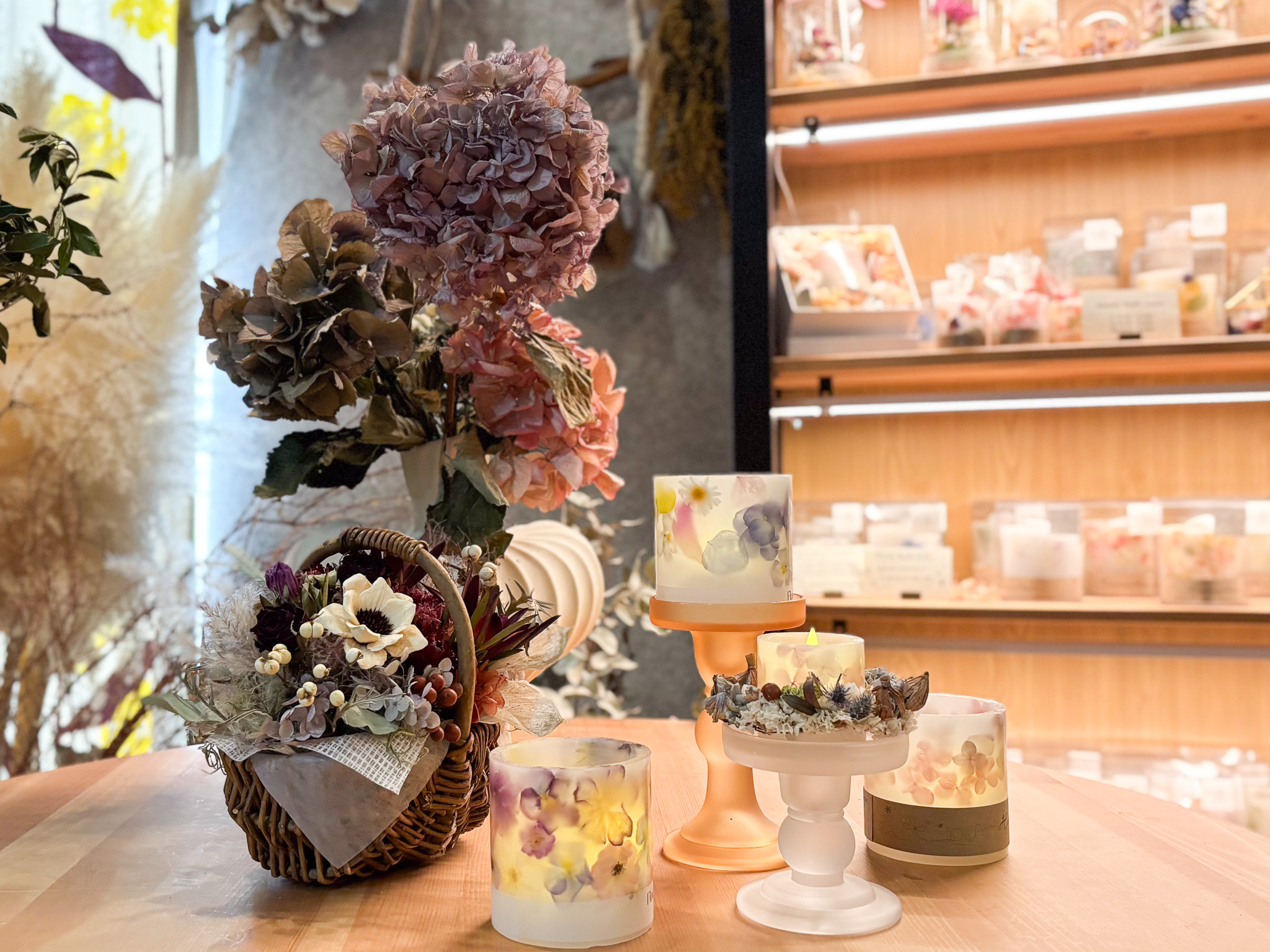 様々なドライフラワーやアレンジメント、作品が所狭しと並んでいます。