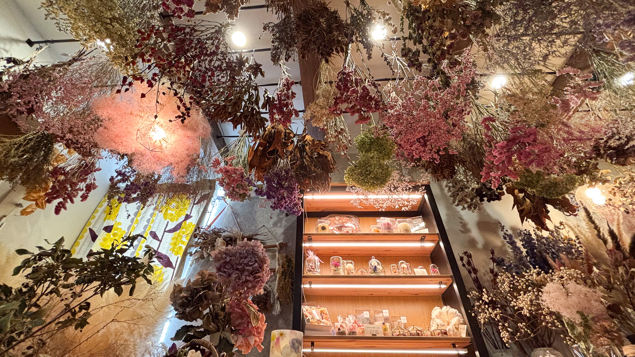 ▼天井にもたくさんのドライフラワーが飾られて、販売されています。