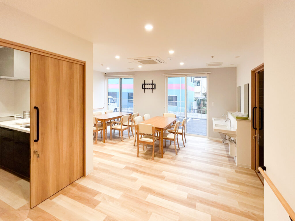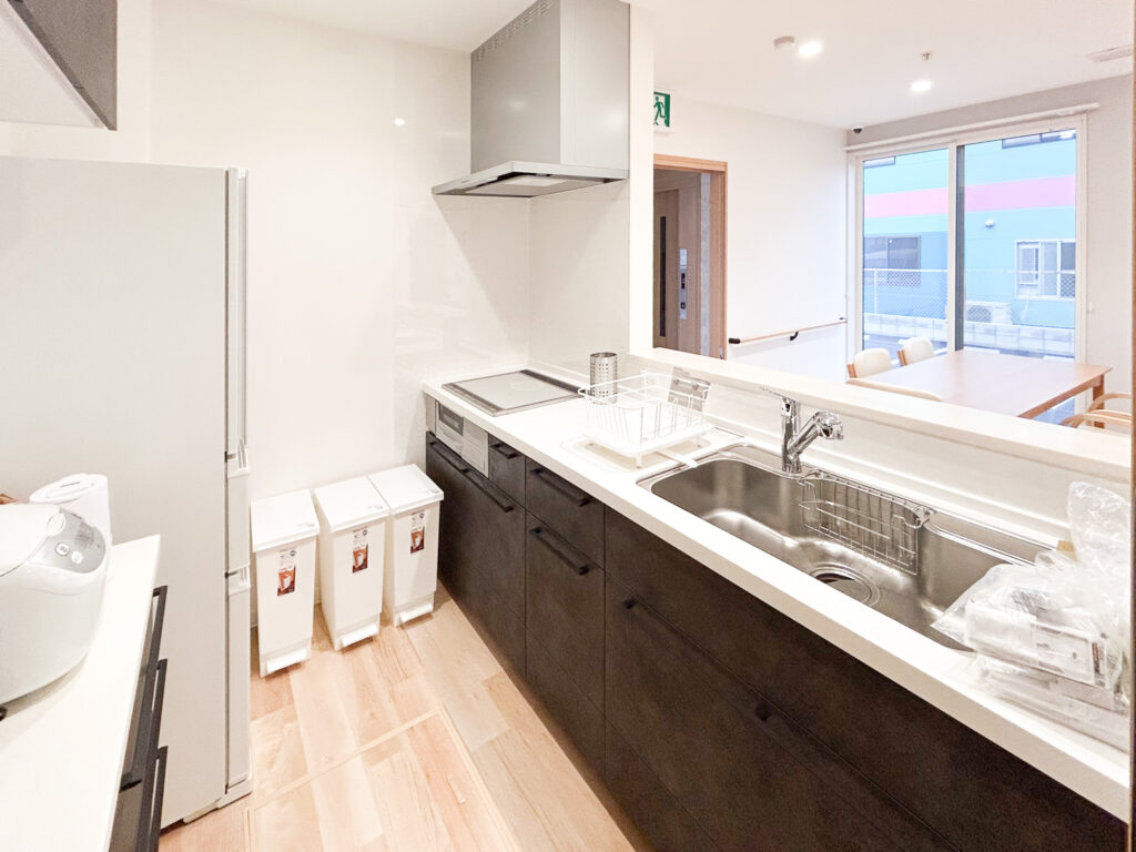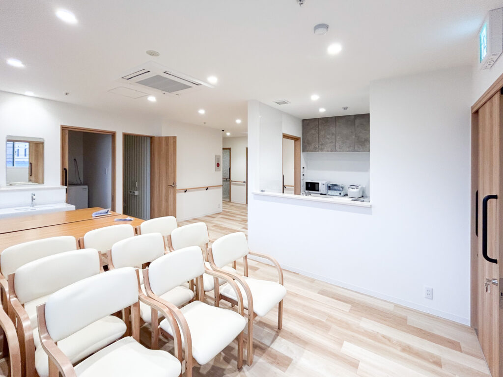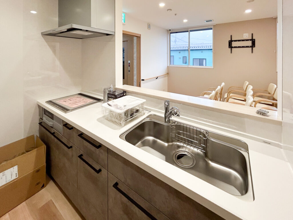 キッチンは見守りと安全性に重視し、対面式で開放的ですが、キッチンを使用するのはスタッフのみ。