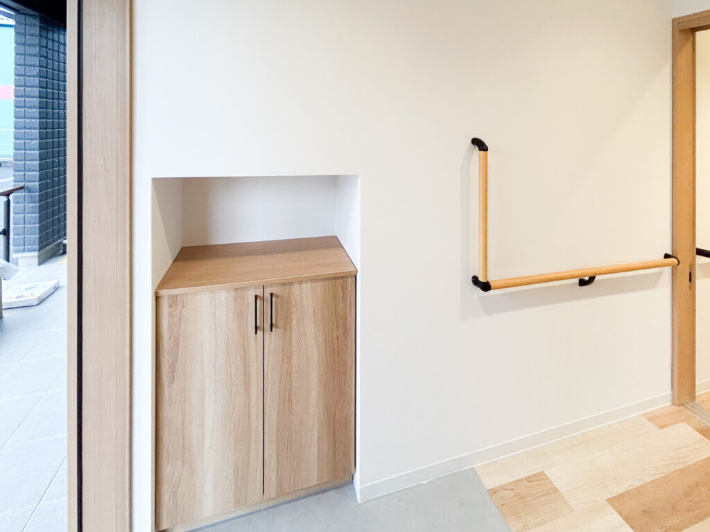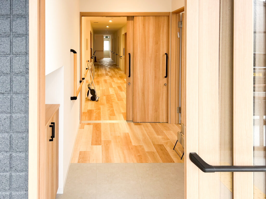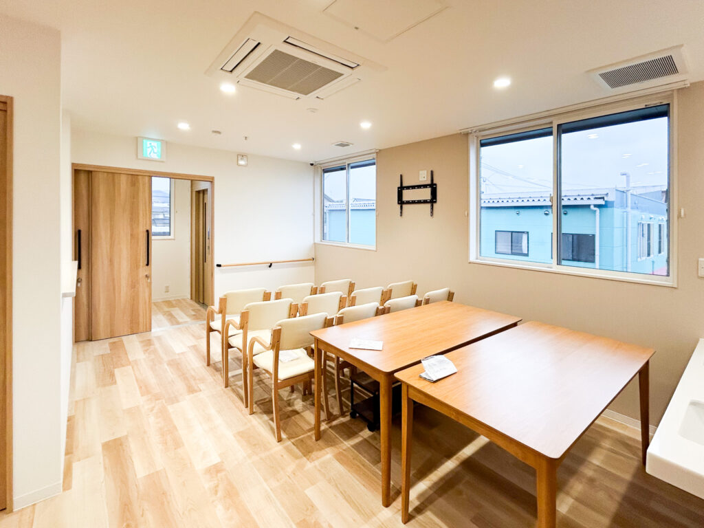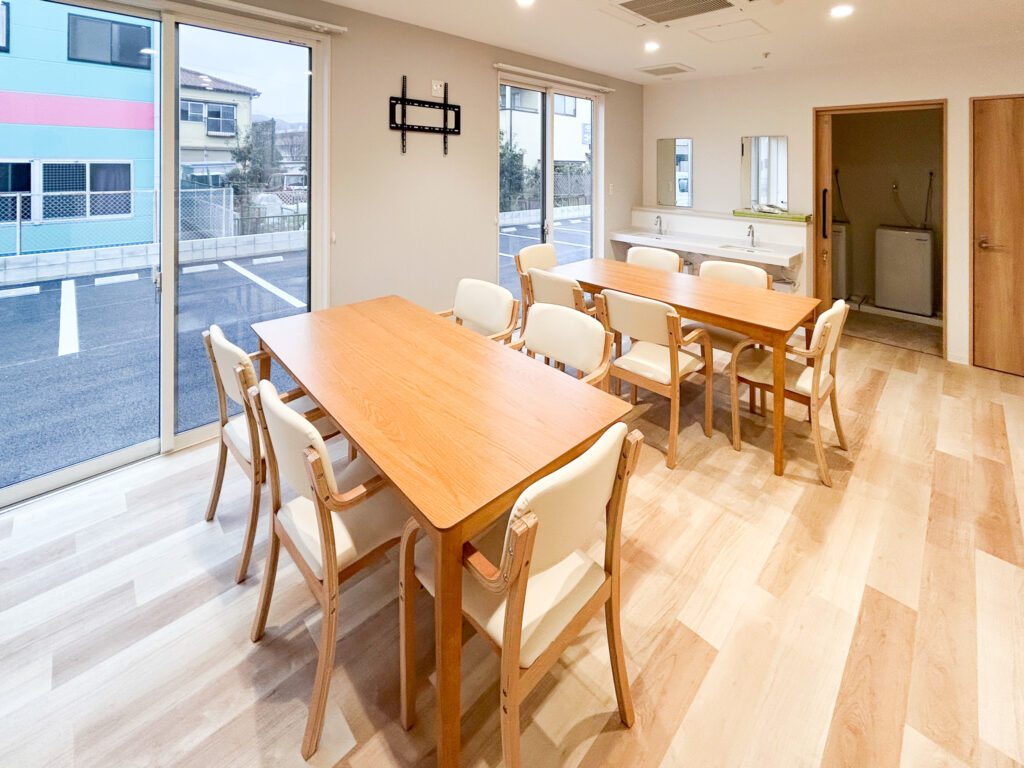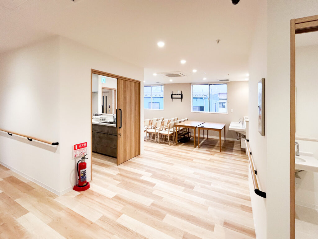 キッチンは見守りと安全性に重視し、対面式で開放的ですが、キッチンを使用するのはスタッフのみ。