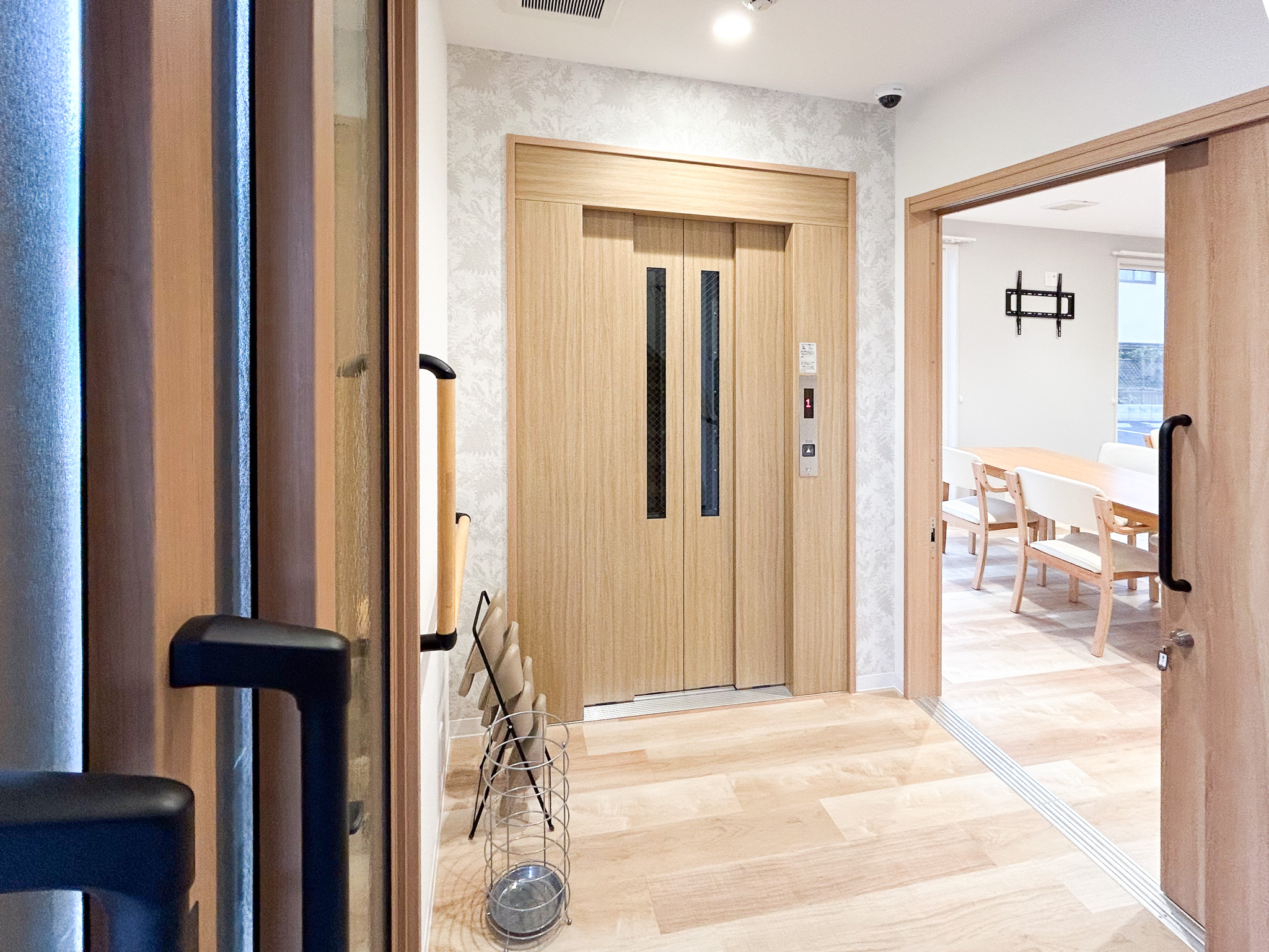 キッチンは見守りと安全性に重視し、対面式で開放的ですが、キッチンを使用するのはスタッフのみ。